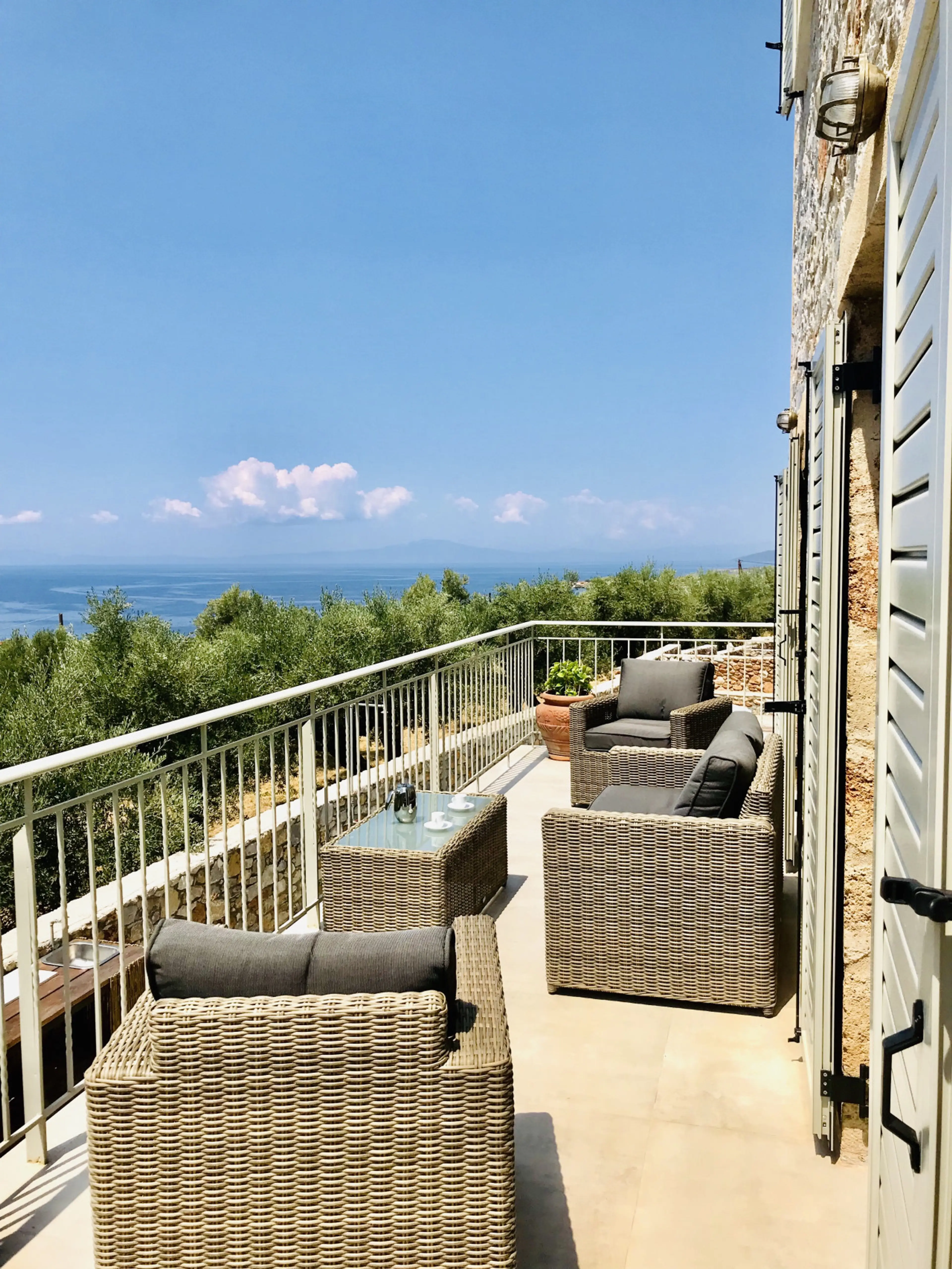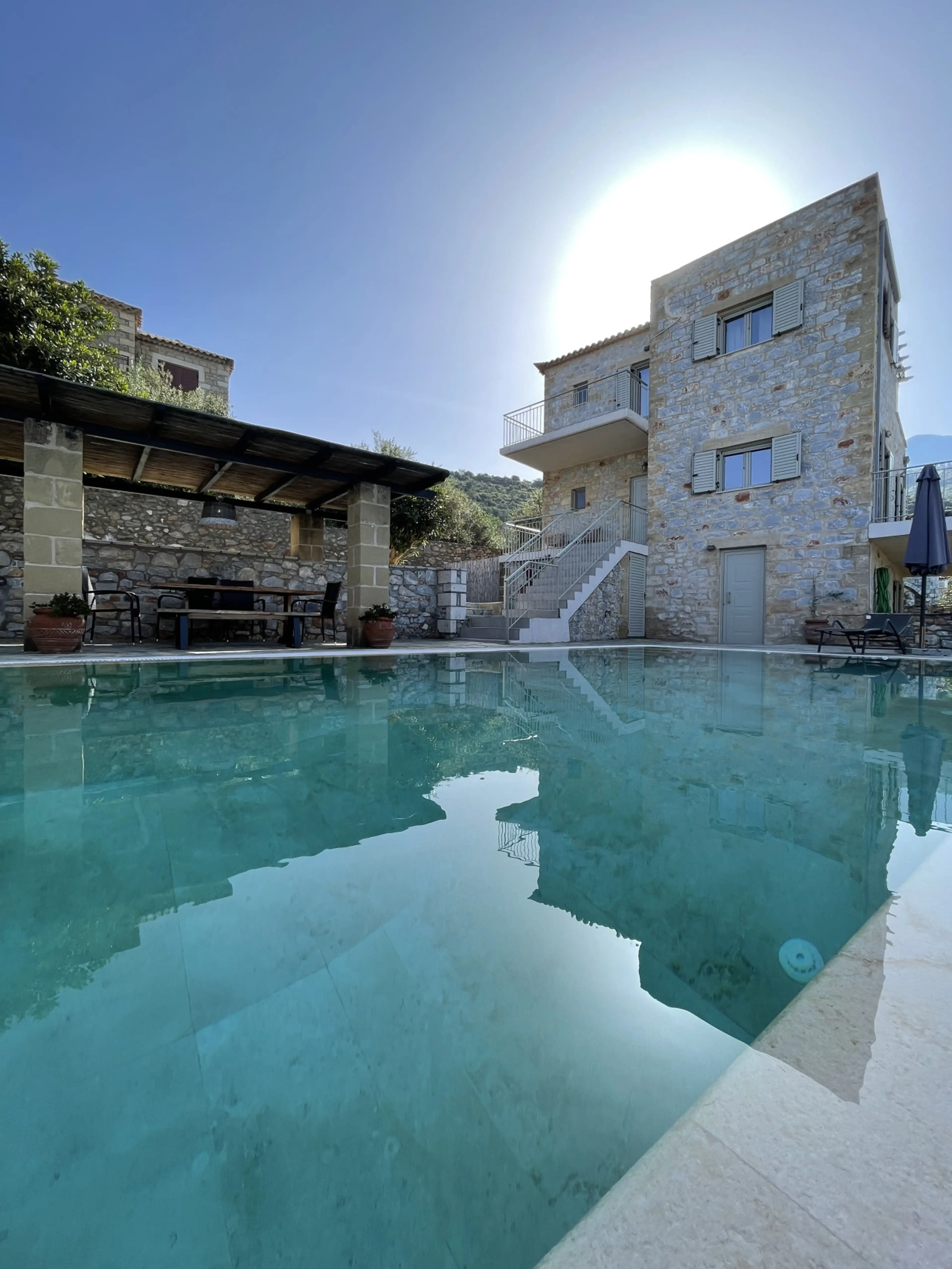 Our Villa has jaw dropping sea views and 3 large balconies to enjoy them from. The outside space offers a private pool for sole use and a shaded pergola area for al fresco dinning. The area is very peaceful and a great base to explore the rugged beauty of the mani or just relax by the pool if you w...